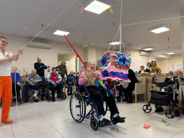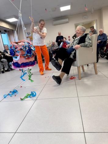 La sala principale si è trasformata in uno spazio festoso, animato da musica, maschere e decorazioni realizzate dagli Ospiti. Il personale di animazione ha proposto coinvolgenti giochi di gruppo, pensati per stimolare partecipazione di Ospiti e Parenti, momento clou della festa è stata la pentolaccia, attesissima e partecipatissima da tutti. La pentolaccia era stata costruita con cura dagli Ospiti durante il laboratorio creativo nei giorni precedenti, con entusiasmo e fantasia.