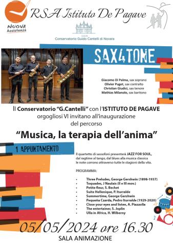 Grazie alla disponibilità e sensibilità della direttrice del Conservatorio, Alessandra Aina, il programma musicale “Musica, terapia dell’anima” si apre domenica 5 maggio 2024, alle ore 16:30, con il quartetto di sassofoni “Jazz for Soul”, composto da Giacomo Di Palma (sax soprano), Oliver Puget (sax contralto), Christian Giudici (sax tenore) e Mathias Milanolo (sax baritono).