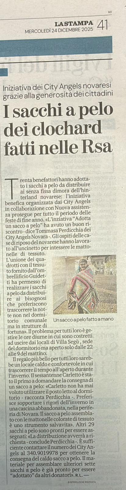 24 dic La Stampa 24/12/2025 I SACCHI A PELO DEI CLOCHARD FATTI NELLE RSA Trenta beneffatori hanno adottato i sacchi a pelo da distribuire ai senza fissa dimora dell'hinterland novarese....(vedi articolo in allegato) Condividi email facebook